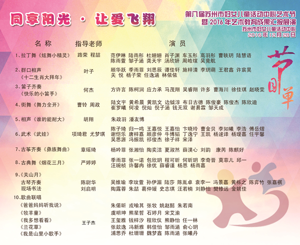 2016年12月28日晚,“同享阳光、让爱飞翔”第八届苏州市妇女儿童活动中心艺术节暨2016年艺术教育成果汇报展演在妇儿苏艺剧场隆重举行。