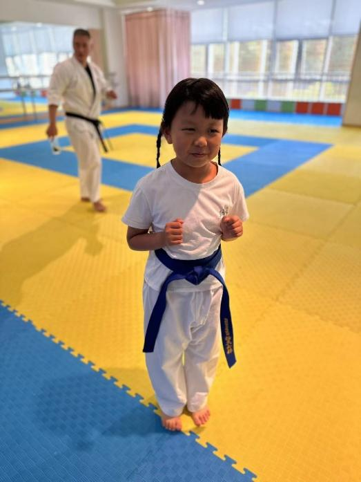 也感谢中心空手道的钱老师,我喜欢和同学们一起竞技训练。快看,我现在已经是一个蓝带的空手道小学员了。
