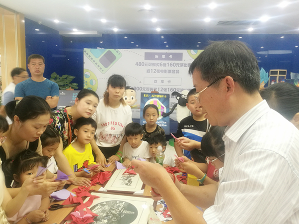 2个小时活动时间里,吴老的讲解没停过,手里剪刀没停过,回答了每一个孩子的问题,满足了每一个孩子的要求和愿望。连参加活动的家长递过的矿泉水,吴老也只喝了一口就放下了。最后的剪纸蝴蝶环节,吴老为小朋友在纸上画出了蝴蝶图案剪刻路径,一共画了17个。