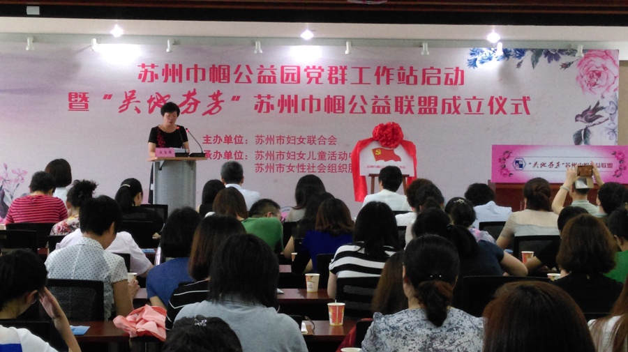 7月12日,市妇联在市妇女儿童活动中心举行了苏州巾帼公益园党群工作站启动暨“吴地芬芳”苏州巾帼公益联盟成立仪式,苏州妇联主席谢建红、市委组织部副部长部张娟、市委组织部组织处处长吴洪斌、市民政局组织处处长王林兴及相关处室领导、各县市区妇联(妇工委)分管主席、组宣部长和首批巾帼公益联盟成员等150余人参加仪式。苏州市妇联谢建红主席,市委组织部张娟副部长等在大会上发言,对这些社会组织提出了希望和目标。我市108家女性社会组织成为联盟的第一批成员;巾帼公益园入园组织所有党员,在党旗前面重温入党誓词。